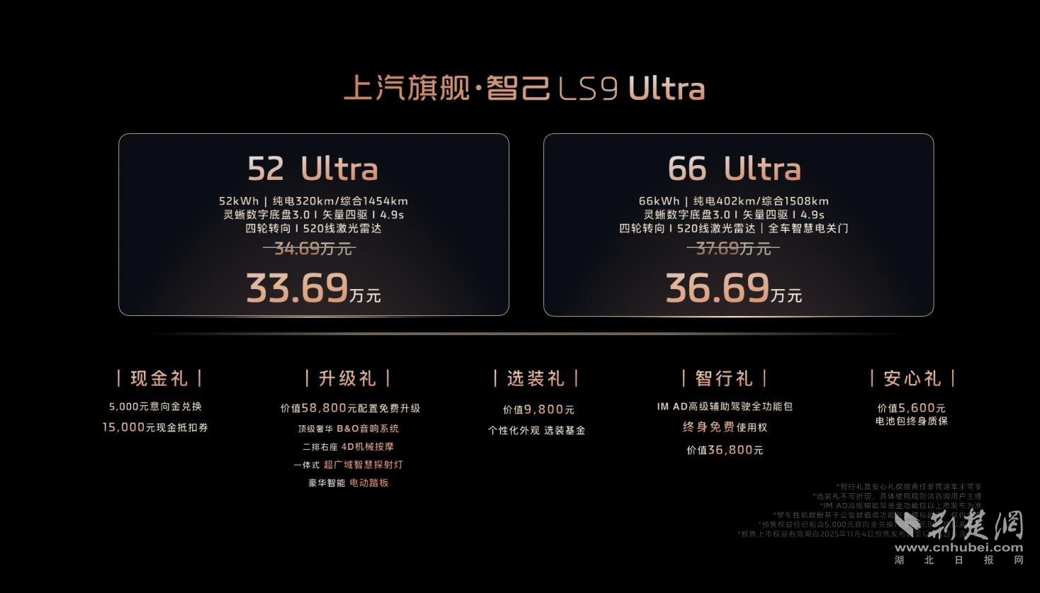 11月4日,上汽旗舰·智己LS9全球首发并正式开启预售。新车重磅首发两个超级增程版本,全系皆Ultra:52 Ultra版,预售权益价33.69万元;66 Ultra版,预售权益价36.69万元。作为汇聚上汽集团70年造车底蕴,集全球顶尖技术打造的旗舰之作,智己LS9以“两大跨代际硬核科技+两大智能时代最强创新”的绝对实力,一举颠覆30万级大六座SUV市场格局,正式宣告9系新王诞生!