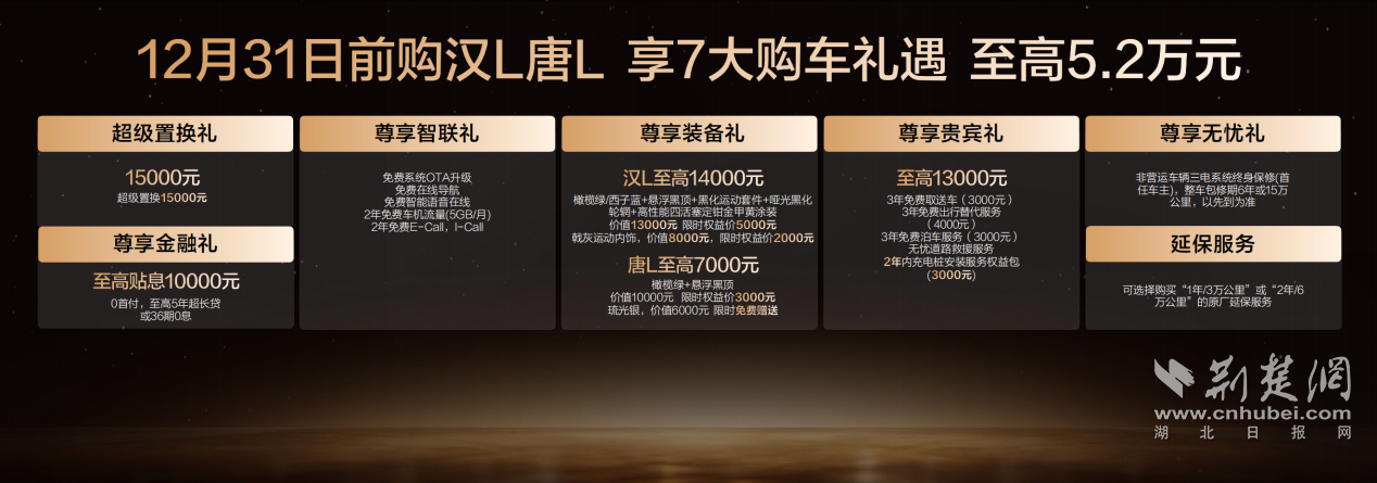 此次,汉L EV共带来3款车型,补贴后售价20.48万~26.48万元;汉L DM 3款车型,补贴后售价19.48万~24.48万元;同时,比亚迪还为用户准备了包含置换补贴在内的至高价值5.2万元尊享礼遇。(以上权益截至12月31日)