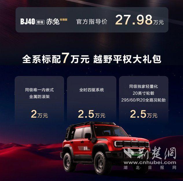 BJ40增程赤兔标准版官方指导价27.98万元!购车即可享有价值7万元的“越野平权大礼包”,包含价值2万元的同级唯一内嵌式金属防滚架、价值2.5万元的全时四驱系统和价值2.5万元的同级唯一轻量化20英寸轮毂与295/60 R20全路况轮胎。