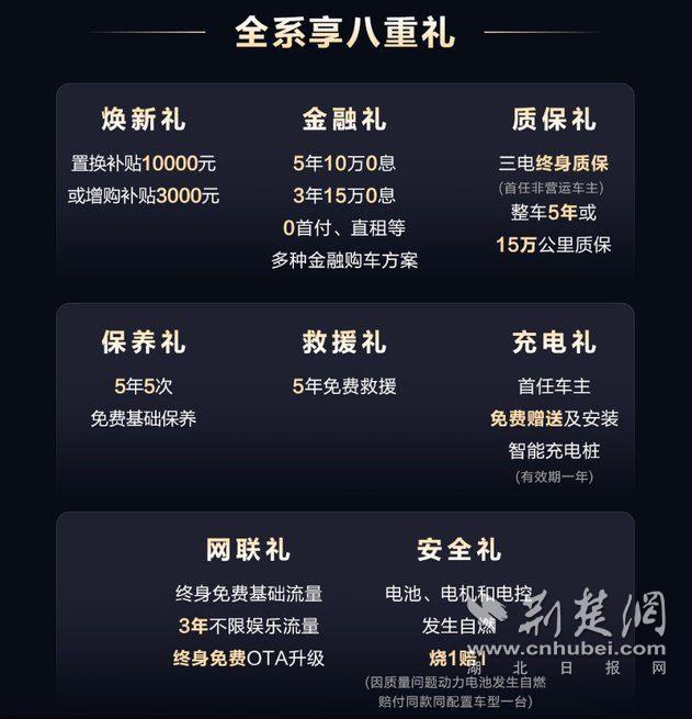 第八重,安全礼:电池、电机和电控发生自燃,烧1赔1(因质量问题动力电池发生自燃赔付同款同配置车型一台)。