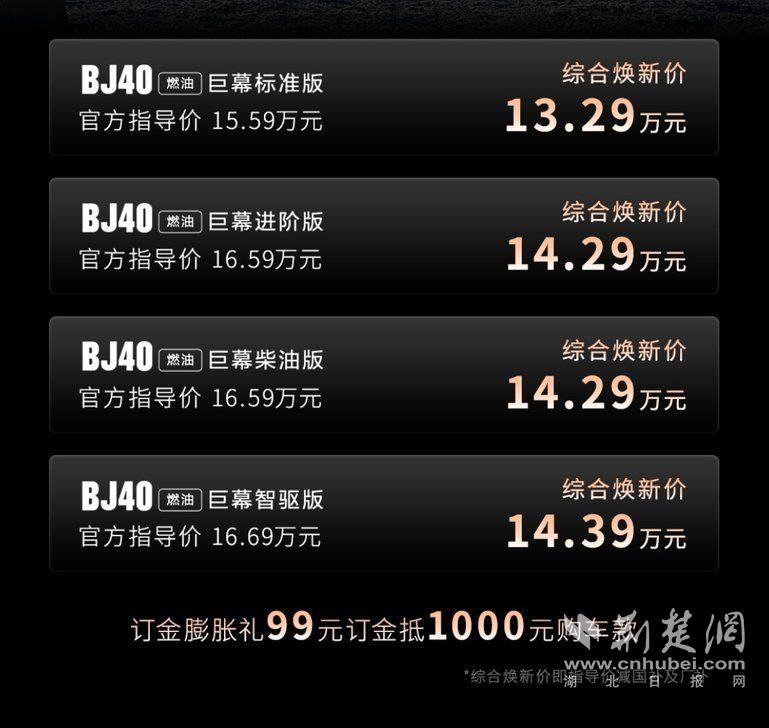 北京越野BJ40燃油巨幕版官方指导价15.59—16.69万元,综合焕新价低至13.29万元。北京越野送上订金膨胀礼:1月27日下订,即可享受“99元订金抵1000元购车款”优惠政策。