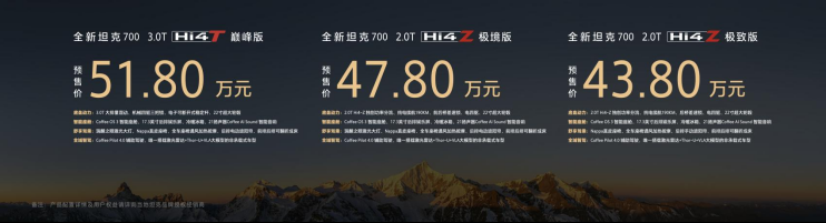 3月30日,“新时代新旗舰——人生自此新境”的坦克品牌发布会上,全新坦克700正式开启预售。新车定位全域豪华SUV新旗舰,推出3.0T Hi4-T、2.0T Hi4-Z两大动力版本共三款车型,官方预售价43.80万—51.80万元。