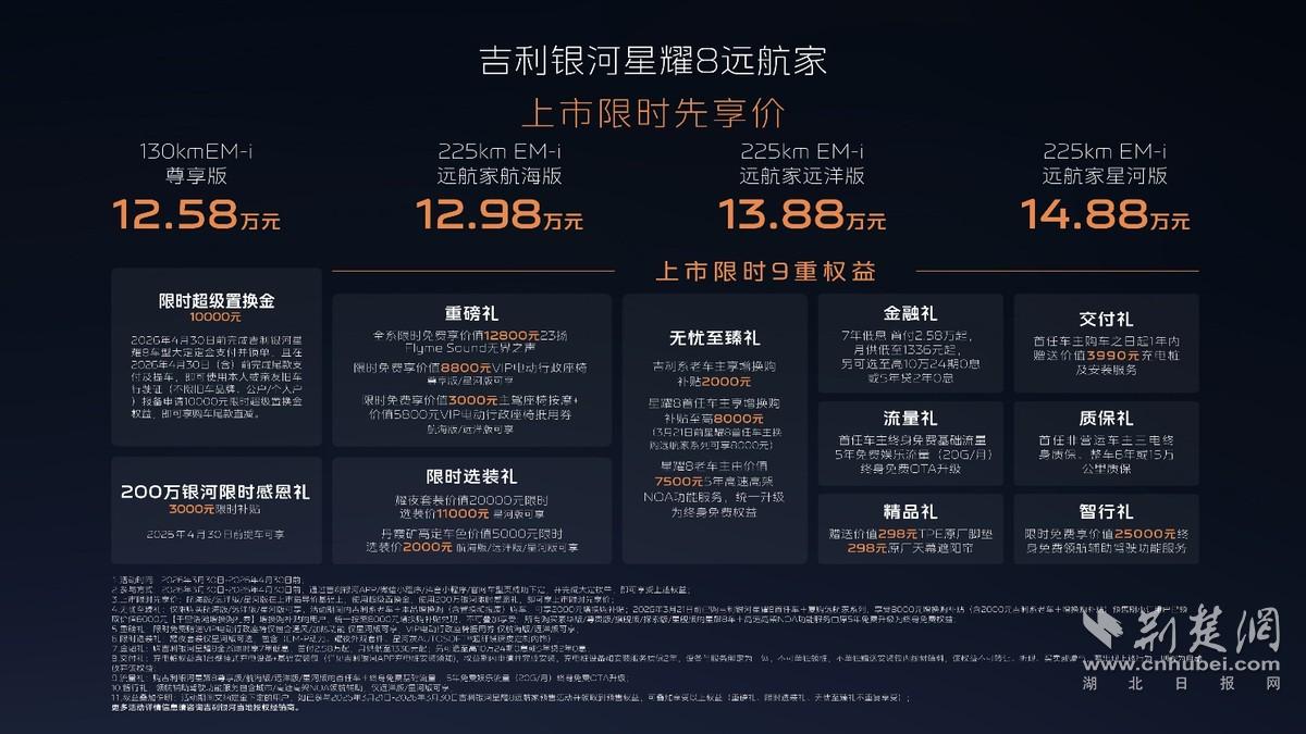 在原有130km EM-i尊享版基础上,吉利银河星耀8远航家系列新增225km EM-i远航家航海版、225km EM-i远航家远洋版、225km EM-i远航家星河版三个续航225km版型,上市限时先享价12.98~14.88万元。即日起,用户可通过吉利银河APP、微信小程序、抖音小程序及官网等官方渠道下定,下定即享9重丰厚购车权益,超高价值,诚意拉满。