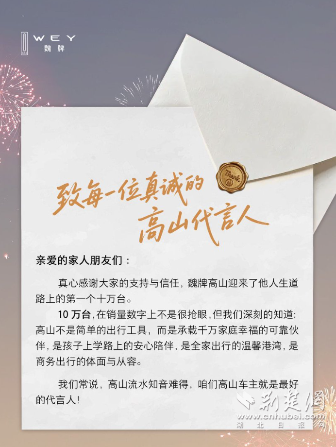 站在10万辆的里程碑上回望,魏牌高山用连续7个月销冠的成绩证明了自己在高端新能源MPV市场的统治力。从“幕后卷王”到“台前显眼包”,魏牌高山用软硬实力的双出圈,诠释了什么叫做“冠军的自我修养”。台前一分钟的高光,幕后十万台的坚守——这份反差,让魏牌高山的冠军形象不止于销量数字,更有了沉甸甸的品质底色和情感温度。